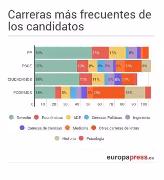 La carrera más frecuente entre los candidatos es Derecho, aunque en el caso de Podemos esa titulación comparte el primer puesto con Historia. Destaca también el alto porcentaje de titulados en Económicas o Administración y Dirección de Empresa, aunque los porcentajes varían de un partido a otro.
