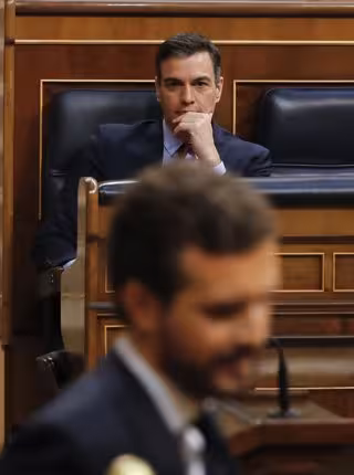 El presidente del Gobierno, Pedro Sánchez, asiste este miércoles al debate de la quinta prórroga del estado de alarma en el Congreso de los Diputados, en Madrid (España), a 20 de mayo de 2020. - Pool