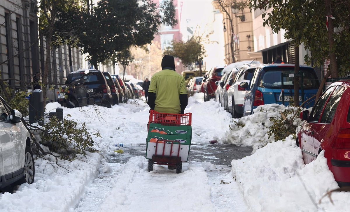 Un hombre arrastra una carretilla por una calle del centro aún con nieve y árboles caídos en Madrid (España), a 13 de enero de 2021. Madrid sigue cubierto de nieve cinco días después de la gran nevada provocada por el paso de la borrasca Filomena. El - Eduardo Parra - Europa Press