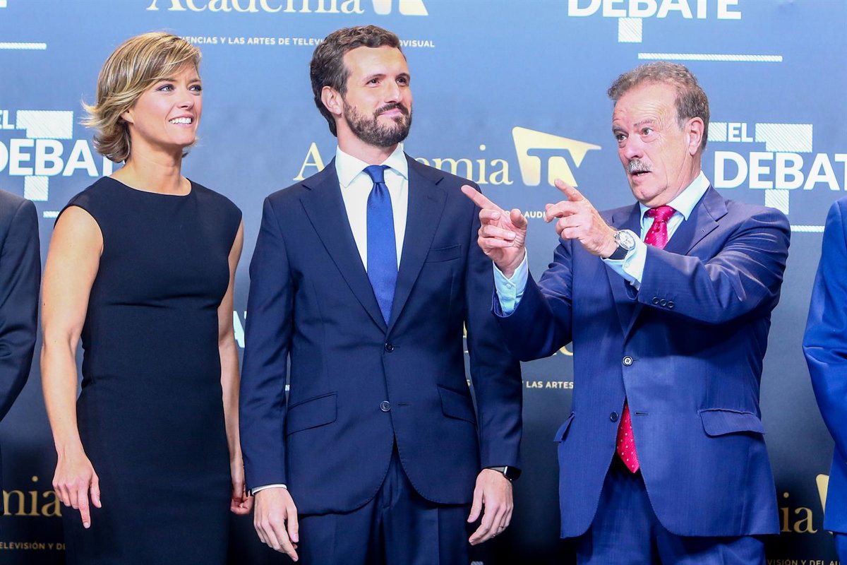 El presidente del PP. Pablo Casado, acompañado por la presidenta de la academia de la televisión, María Casado, t el presidente emérito de la academia de televisión , Manuel Campo Vidal, llega al debate electoral en televisión en el Pabellón de Cristal - Ricardo Rubio - Europa Press