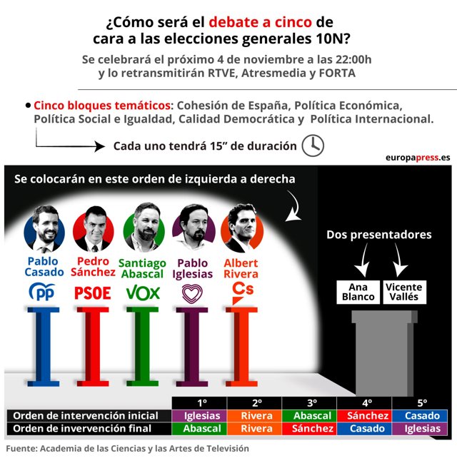 El debate del 4 de noviembre será el único de la campaña para el 10 de noviembre en el que participarán los líderes de los cinco partidos nacionales que obtuvieron más apoyo en los últimos comicios. Se podrá seguir a través de las redes sociales de Europa Press y en directo por RTVE, Atresmedia, Forta, medios que de momento han expresado su interés por emitirlo.