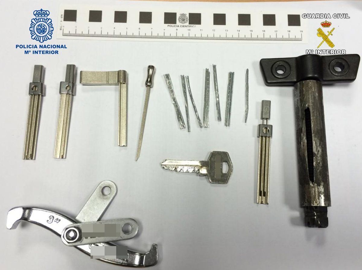 Además de las detenciones se realizaron registros en los domicilios de los detenidos, donde los agentes se incautaron de multitud de efectos, presumiblemente sustraídos, y todo tipo de instrumentos utilizados para cometer los robos, como plásticos para el procedimiento del "resbalón", martillos empleados para fracturar cerraduras por el método del "bumping" y todos los elementos usados en la modalidad del "impresioning".