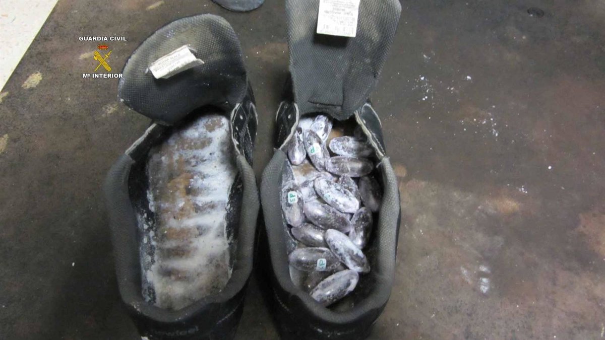 Cuatro personas más fueron detenidas al portar adosada al cuerpo o en el interior de los zapatos hachís. Uno de los detenidos portaba en el interior de las zapatillas de deporte que calzaba 68 envoltorios de resina de hachís, arrojando un peso de 755 gramos.