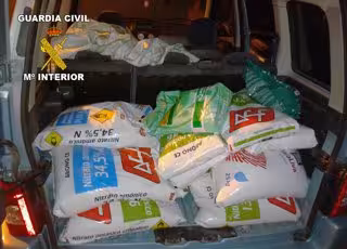 Igualmente, los agentes hallaron en la furgoneta gran cantidad de productos fitosanitarios, abonos y fertilizantes que posteriormente se pudo constatar que habían sido sustraídos en dos explotaciones agrícolas de Cieza.