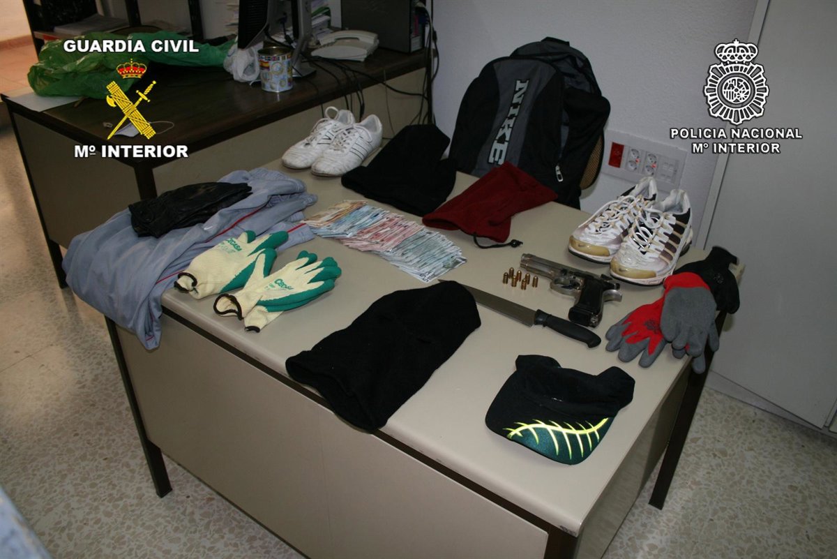 Durante la operación 'A-92-Caña', los agentes se han incautado de 3.095 euros en efectivo procedentes del botín de los dos últimos asaltos perpetrados en la barriada capitalina de La Cañada, una pistola detonadora con munición, varias armas blancas, pasamontañas y hasta seis vehículos robados que utilizaban para los atracos.