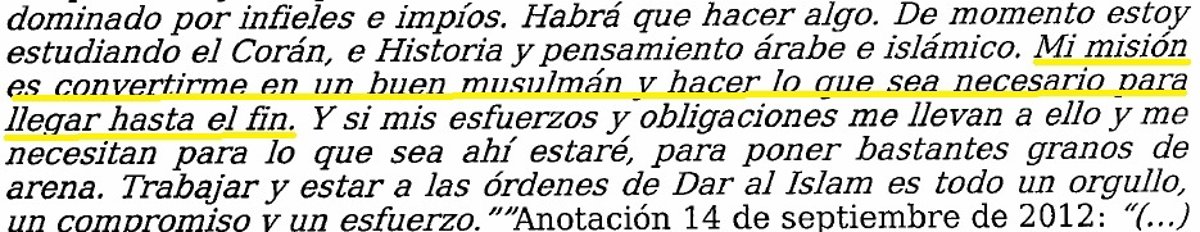 Ya llevaba mucho tiempo pensando en mi paso o no, a final lo he hecho, estoy muy contento de adquirir este compromiso y lo que conlleva, ser musulmán en un mundo cristiano dominado por infieles e impíos. Habrá que hacer algo. De momento estoy estudiando el Corán, e Historia y pensamiento árabe e islámico. Mi misión es convertirme en un buen musulmán y hacer lo que sea necesario para llegar hasta el fin.