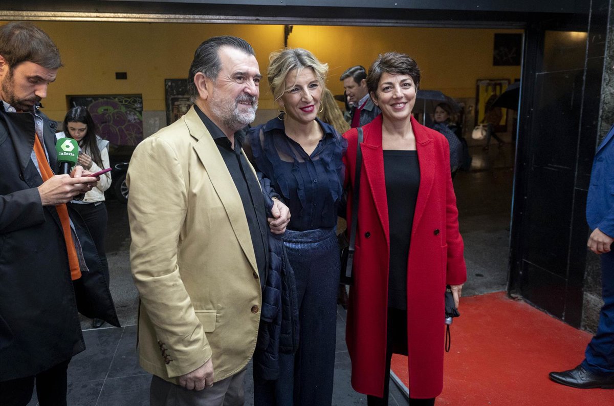 (I-D)El periodista de elDiario.es Arsenio Escolar, la ministra de Trabajo, Yolanda Díaz, y la Ceo de elDIario.es, Rosalía Lloret, en su llegada a la representación del espectáculo Diario Vivo, en el Teatro Fígaro, a 15 de noviembre de 2022, en Madrid. - Alberto Ortega - Europa Press