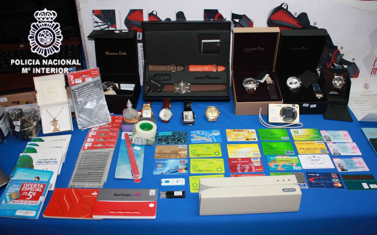 Con el preceptivo mandamiento judicial, los agentes efectuaron dos registros en domicilios de los ahora detenidos hallando en su interior tarjetas de crédito falsificadas, una lectora grabadora, ordenadores portátiles, documentación falsa, joyas, abundante ropa de primeras marcas y numeroso material electrónico.