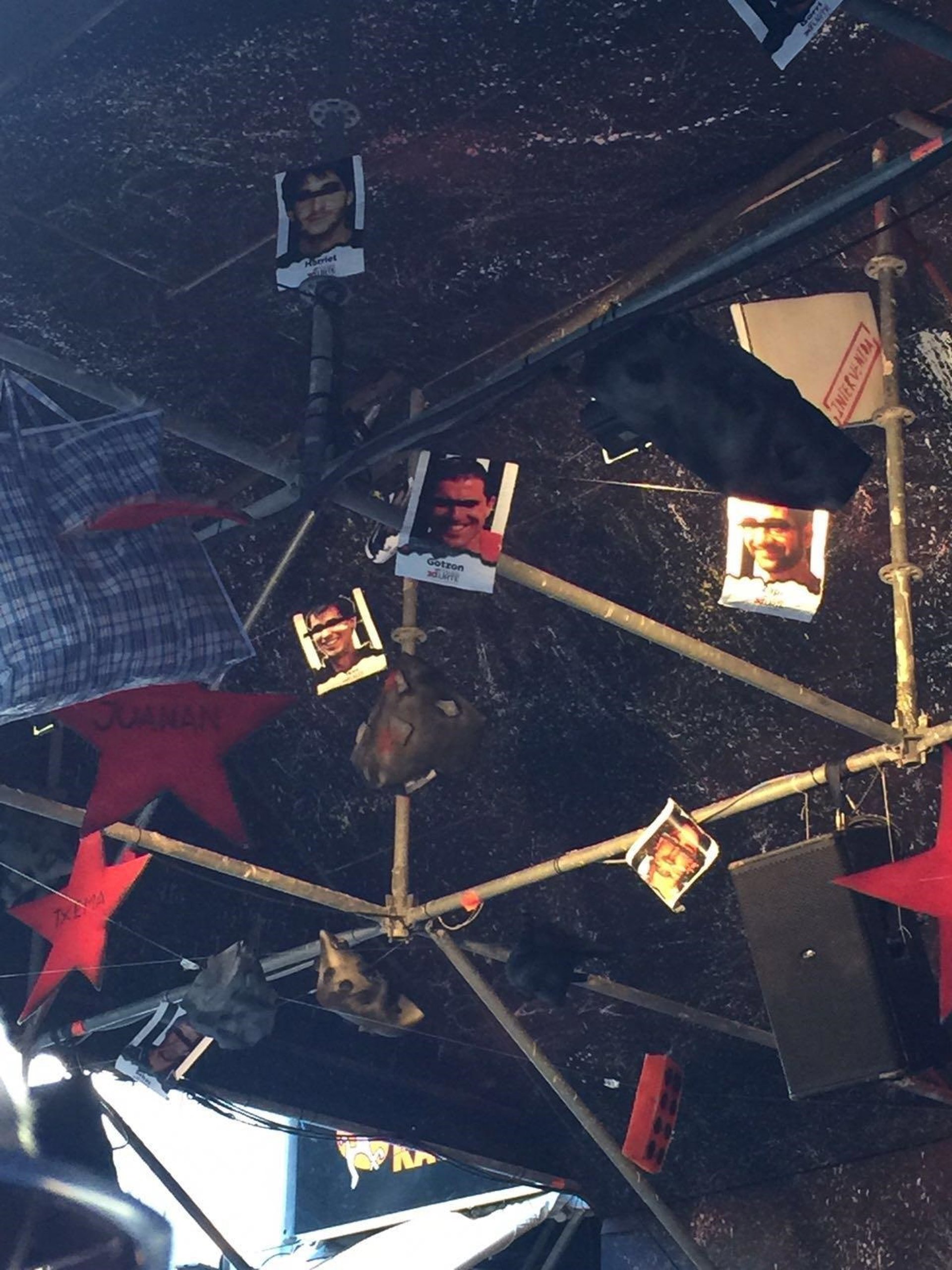El escrito precisa que a la exhibición de dichas fotografías se suma la leyenda 'Euskal preso eta iheslariak etxera' (Presos y refugiados en casa) que se exhibe en la 'txosna' así como figuras en forma de estrellas rojas de cinco puntas que cuelgan al lado de las fotografías con el nombre de cada uno de los etarras en su interior, como símbolo utilizado por la organización terrorista ETA.