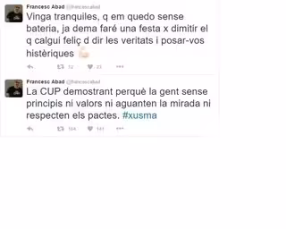 Abad asumió el cargo el 17 de mayo y el pasado domingo escribió en un apunte en Twitter: "La CUP demostrando por qué la gente sin principios ni valores ni aguantan la mirada ni respetan los pactos. #chusma".