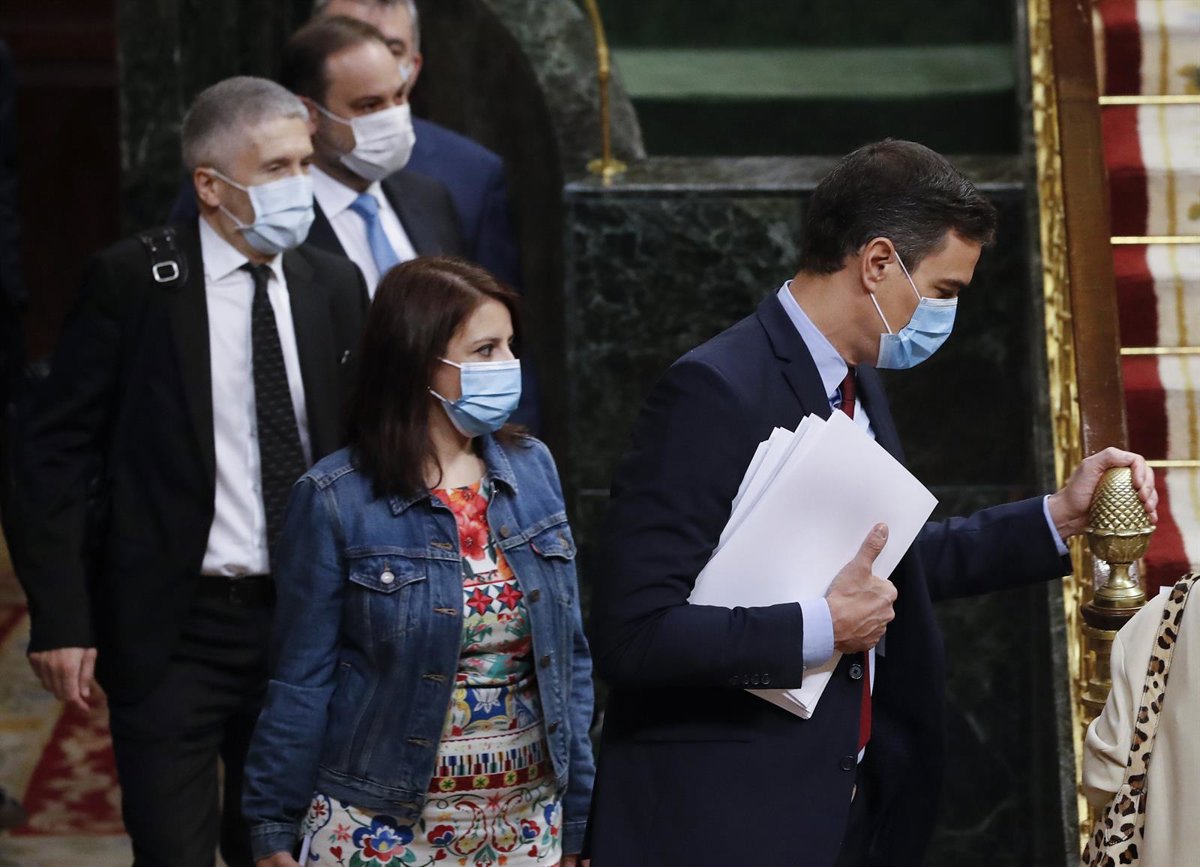 El presidente del Gobierno, Pedro Sánchez, la portavoz parlamentaria, Adriana Lastra y los ministros Fernando Grande- Marlaska y José Luis Ábalos, en el hemiciclo del Congreso, en Madrid (España), a 20 de mayo de 2020. - Pool