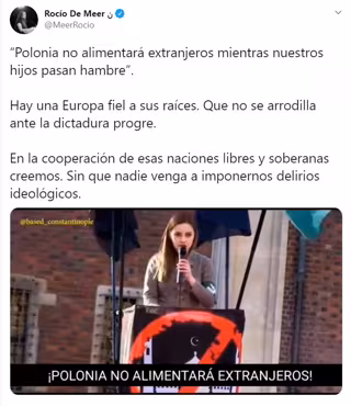 En su cuenta de Twitter, De Meer ha compartido un vídeo en el que se ve a una mujer defendiendo el "nacionalismo" en Polonia, sus leyes y sus valores. "Polonia no alimentará extranjeros mientras nuestros hijos pasen hambre", dice en un extracto del discurso, destacado por la diputada de Vox.