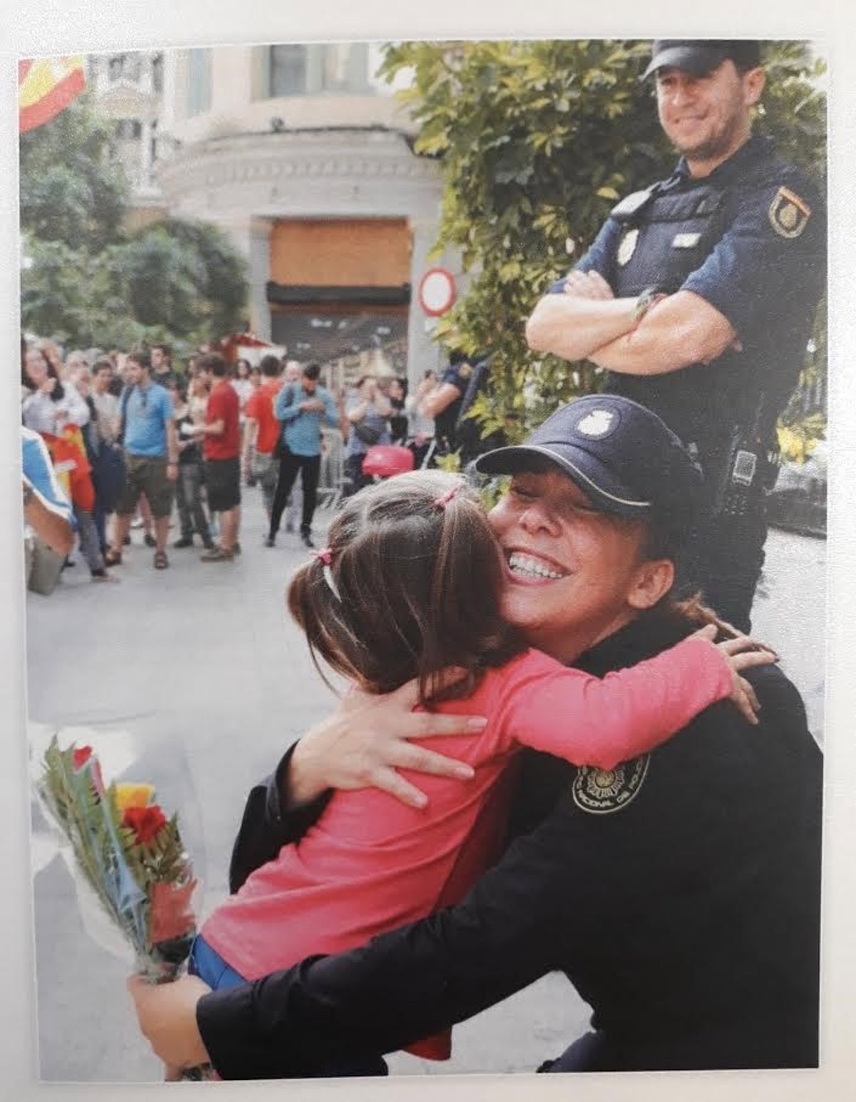 La fotografía muestra a una niña de espaldas que se abraza a una agente de la Policía Nacional tras entregarle un ramo de flores. De fondo se ve a otro policía de uniforme sonriente y varios de los ciudadanos que se agolparon en la Jefatura de Vía Laietana, uno de los puntos de mayor virulencia en las protestas contra la sentencia del Supremo y edificio que los partidos independentistas quieren cerrar para convertirlo en un museo de la represión franquista.