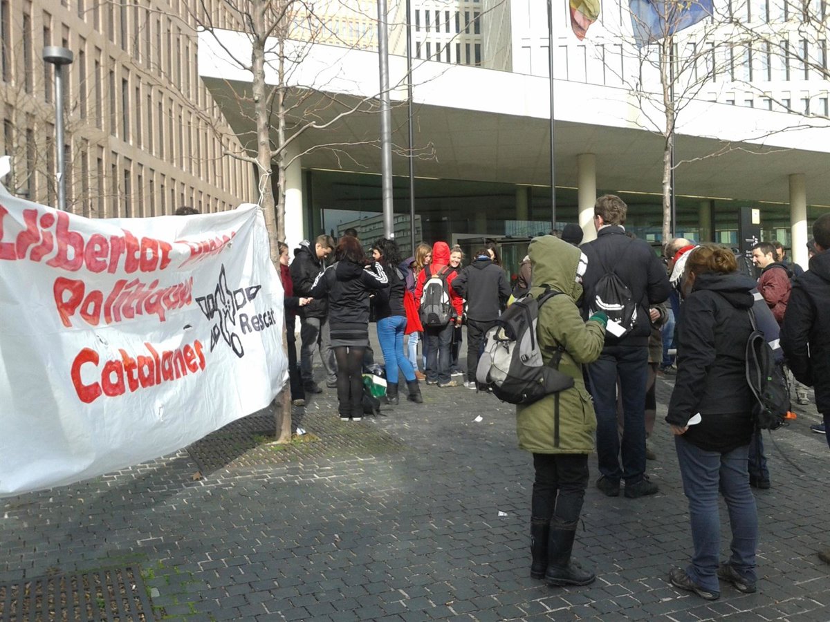 En una concentración convocada ante las puertas de la Ciudad de la Justicia, el colectivo Rescat ha criticado que la imputación de Blasi y Saavedra es "una venganza" por no haber podido saber quién eran los encapuchados que quemaron las banderas españolas.
