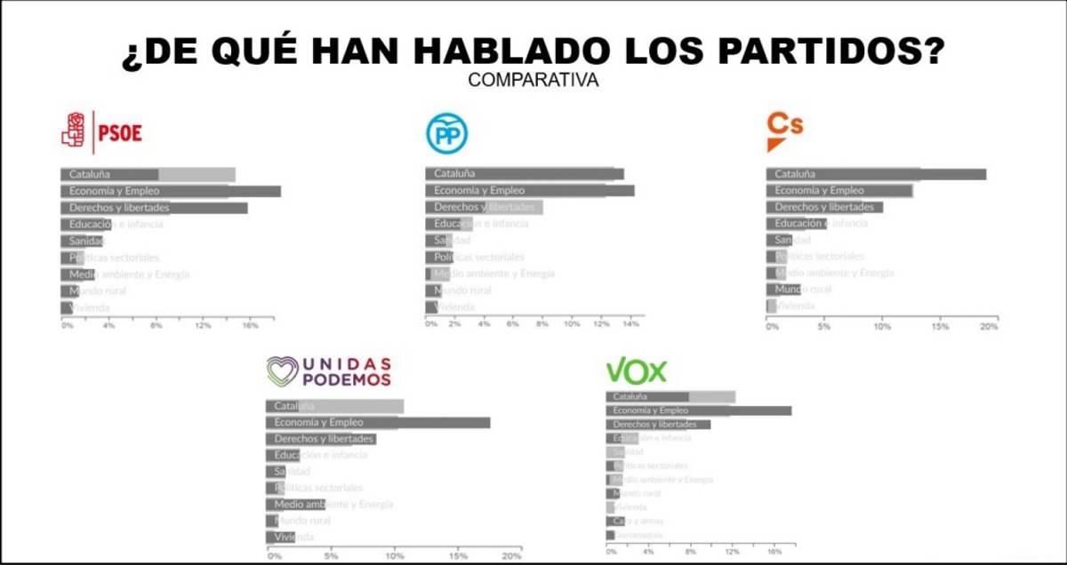 El PSOE, Unidas Podemos, PP y Vox han hablado más de economía y empleo en sus perfiles de redes sociales mientras que Ciudadanos se ha centrado más en Cataluña, dejando los otros dos en segundo lugar. Justo a la inversa del Partido Popular, que ha mantenido en segundo plano el debate catalán.