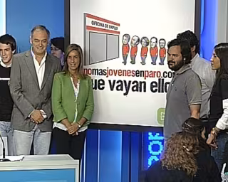 En el panel de presentación de la campaña figura una oficina del INEM y el lema 'nomasjovenesenparo.com'. Al lado aparece el mensaje, 'que vayan ellos' y los dibujos de José Luis Rodríguez Zapatero, Alfredo Pérez Rubalcaba, Elena Salgado, Manuel Chaves, José Blanco, José Montilla y Leire Pajín.