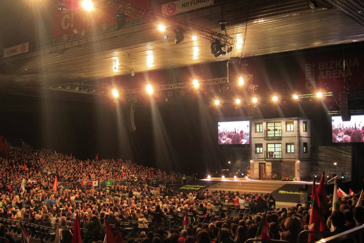 En el acto del BEC, con un escenario en el que se veía una casa de dos pisos y una plaza bautizada como 'Euskal Bidea (Vía Vasca)', se ha leído un breve comunicado de Otegi que el pasado 4 de marzo publicó en su blog, y que señalaba que este domingo estaría con los asistentes en el evento "compartiendo pasos desde el patio de la cárcel".