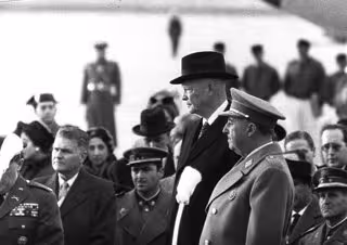 - 21 y 22 de diciembre de 1959: Dwight D. Eisenhower recibió una multitudinaria acogida por parte del pueblo español. Las crónicas de la época cifran en un millón de personas a los españoles que se echaron a la calle para recibir al amigo americano. Si EEUU excluyó a España del Plan Marshall de reconstrucción europea tras la II Guerra Mundial, ahora descubría que Franco podía ser un aliado frente al comunismo. La posición geoestratégica de España de entrada al Mediterráneo llevó además a EEUU a apoyar económicamente a España a cambio de la construcción y el uso de bases militares en territorio español, las de Torrejón de Ardoz (Madrid), Rota (Cádiz), Morón de la Frontera (Sevilla) y Zaragoza.