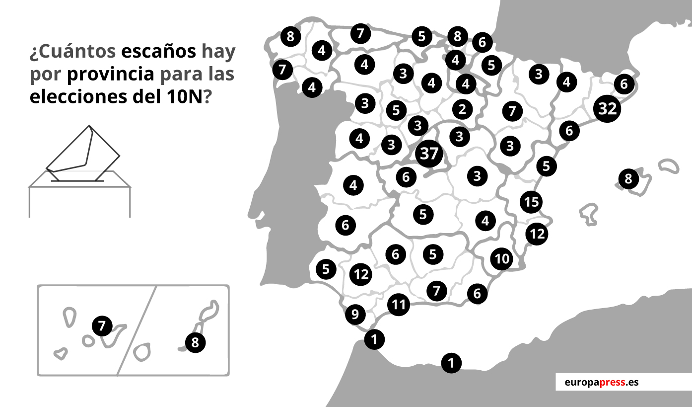 -- Este 10 de noviembre se adjudicarán 558 escaños: 350 diputados elegidos en 50 provincias más Ceuta y Melilla (52) y 208 senadores repartidos entre 59 circunscripciones.