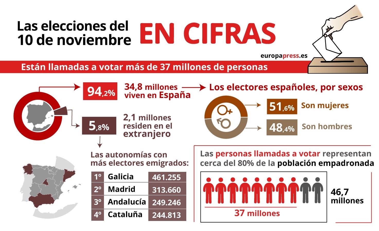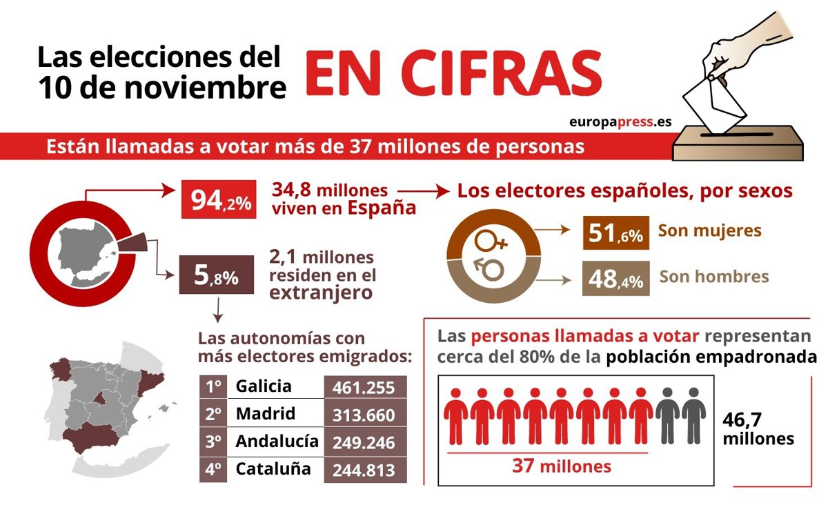 -- De esos potenciales votantes, 34.872.049 ciudadanos viven en España y los otros 2.128.559 residen en el extranjero y, para poder ejercer su derecho al voto, debieron de pedirlo por anticipado. Las autonomías con más españoles emigrados son, por este orden, Galicia (461.255 electores), Madrid (313.660), Andalucía (249.246) y Cataluña (244.813).