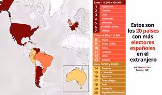 Actualmente, el país con el mayor número de electores españoles en el extranjero es Argentina, con 420.897. De hecho, América concentra a varias de las naciones con mayor número de electores españoles en otros países --Estados Unidos (121.038), México (119.390), Cuba (136.518), Brasil (112.784) y Venezuela (130.273). El 'top 10' lo completan países en Europa como Francia (214.357), Alemania (125. 025), Reino Unido (103.509) y Suiza (96.613).