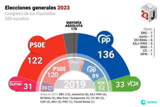 El PP ha ganado las elecciones generales de este domingo con 136 diputados, pero se queda lejos de la mayoría absoluta de 176, y el PSOE, en segundo lugar, aguanta con 122 escaños.