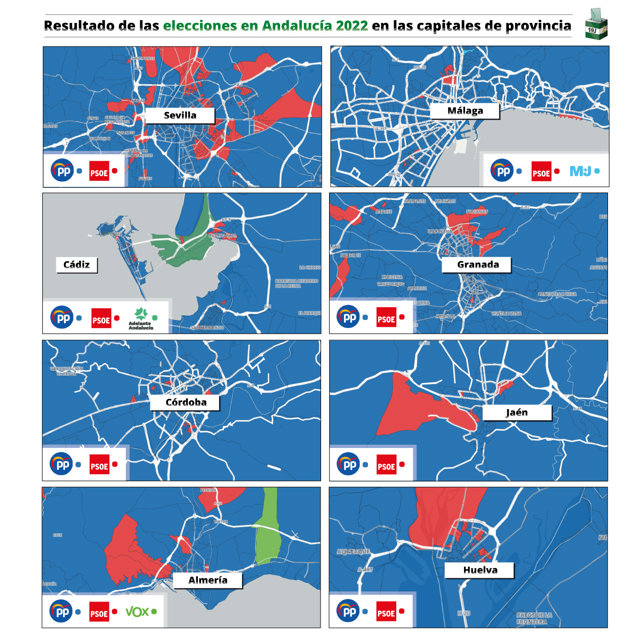 Además, ha sido la primera fuerza en todas las provincias. Destaca Málaga, donde ha obtenido diez de los diecisiete escaños en liza y Sevilla, donde ha ganado por primera vez.