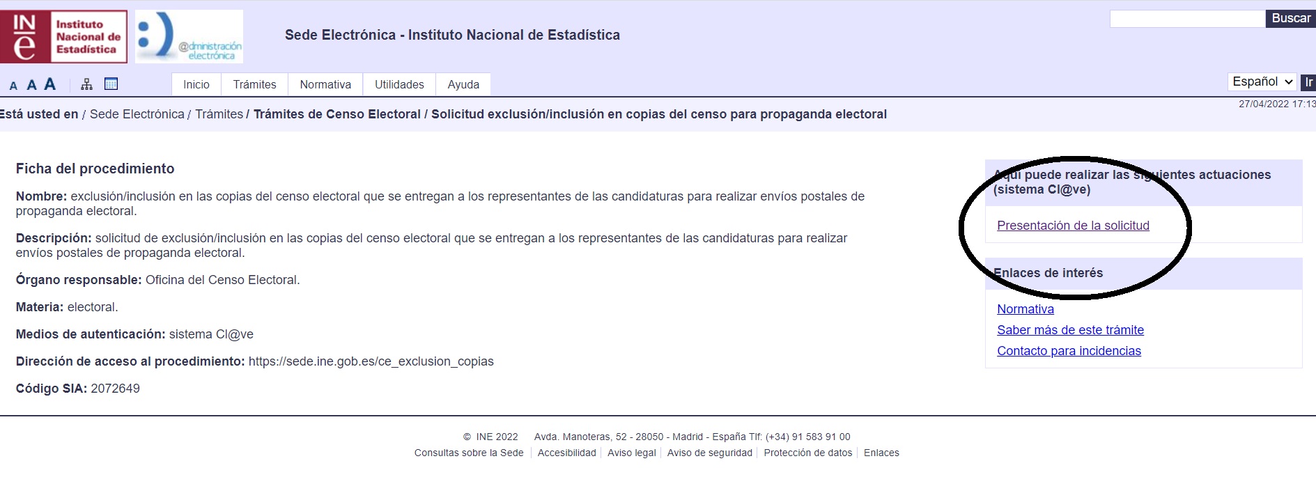 Lo primero que hay que hacer para realizar la solicitud es pinchar en este enlace de la web del INE e ir al apartado 'presentación de la solicitud'.