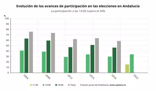 La participación en las elecciones autonómicas alcanza el 34,25% en Andalucía hasta las 14.00 horas, lo que supone 4,33 puntos más que en los comicios celebrados en diciembre de 2018, cuando se situó en el 29,92%, según los datos facilitados por el consejero de la Presidencia, Administración Pública e Interior, Elías Bendodo, con el 100% de las mesas contabilizadas.