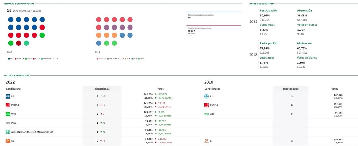 Con el 98,88% escrutado, el PP gana por primera vez las elecciones autonómicas en la provincia de Sevilla y consigue nueve escaños, logrando un 40,08% de los votos. Esta cifra supone seis escaños más que los tres parlamentarios obtenidos en los comicios de 2018. Son los mejores resultados nunca conseguidos por el PP de Sevilla en una convocatoria electoral.