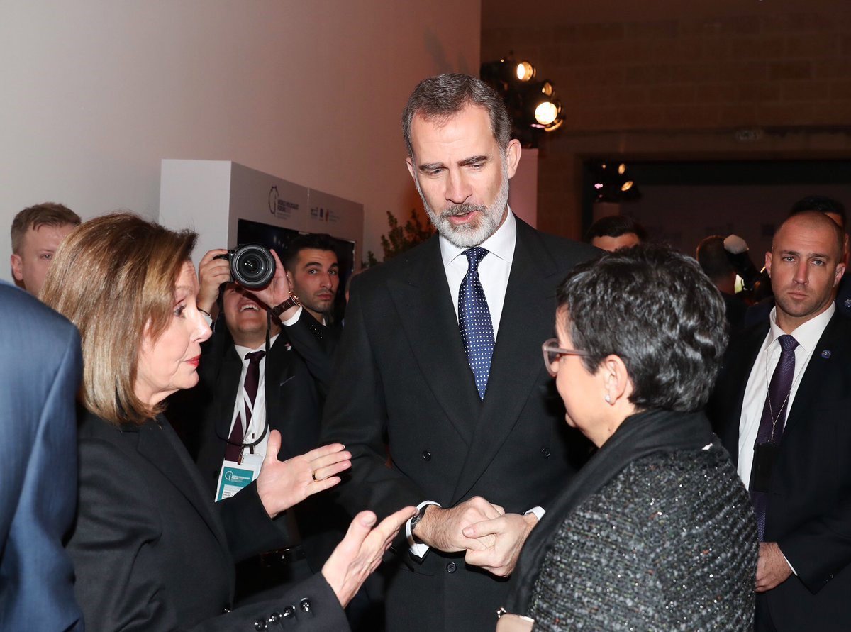 Felipe VI, acompañado por la ministra de Asuntos Exteriores, UE y Cooperación, Arancha González (d), habla con la presidenta de la Cámara de Representantes de EEUU, Nancy Pelosi (i), en el Día Internacional de Conmemoración del Holocausto en Jerusalén - Casa de S.M. el Rey