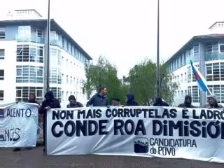Mientras el alcalde compostelano comparece ante el juez, una docena de personas convocadas por la Candidatura do Povo se concentran en el exterior del edificio judicial gritando consignas y con pancartas en las que puede leerse: "Conde Roa paga lo que debes", "Conde Roa, tu aliento nos defrauda" y "No más corruptelas ni ladrones. Conde Roa dimisión".