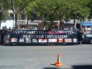Con una pancarta de fondo negro y el lema 'Ayuntamiento-Palacio' con nuestros impuestos', los nueve sindicatos con representación en el Consistorio de la capital han reclamado a la alcaldesa madrileña que se sienten a negociar con ellos para tratar la situación de los empleados municipales.