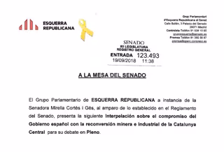 Los senadores de ERC incluyen un lazo amarillo en las preguntas al Gobierno que registran en la Cámara Alta, un añadido que empezaron a incorporar a sus escritos a finales de mayo y que va en línea con la exhibición en la ropa de los senadores de este símbolo independentista.