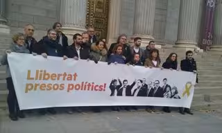 El parlamentario ha lanzado esta propuesta ante la Puerta de los Leones del Congreso, donde los diputados y senadores de ERC han desplegado una pancarta de apoyo a los exmiembros del Gobierno catalán encarcelados y a los presidentes de la Asamblea Nacional Catalana (ANC), Jordi Sànchez, y de Òmnium Cultural, Jordi Cuixart.