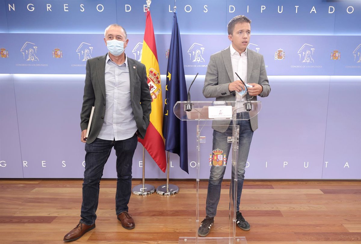 Archivo - El diputado de Compromís en el Congreso, Joan Baldoví (i), y el líder de Más País, Íñigo Errejón, en una rueda anterior a la celebración de la Junta de Portavoces en el Congreso de los Diputados, a 14 de septiembre, en Madrid (España). - Eduardo Parra - Europa Press - Archivo