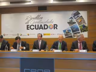Antes de su cita con la vicepresidenta, Glas participó en el Encuentro Empresarial España-Ecuador en la sede de la Confederación Española de Organizaciones Empresariales (CEOE). Ante un auditorio de alrededor de 50 empresarios, representantes de importantes compañías españolas, explicó las oportunidades de negocios en el país y subrayó los avances en infraestructuras y la estabilidad que ofrece su país.