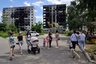 Varias personas delante de edificios dañados por los bombardeos en la localidad ucraniana de Borodianka - Sergei Chuzavkov / Zuma Press / ContactoPhoto