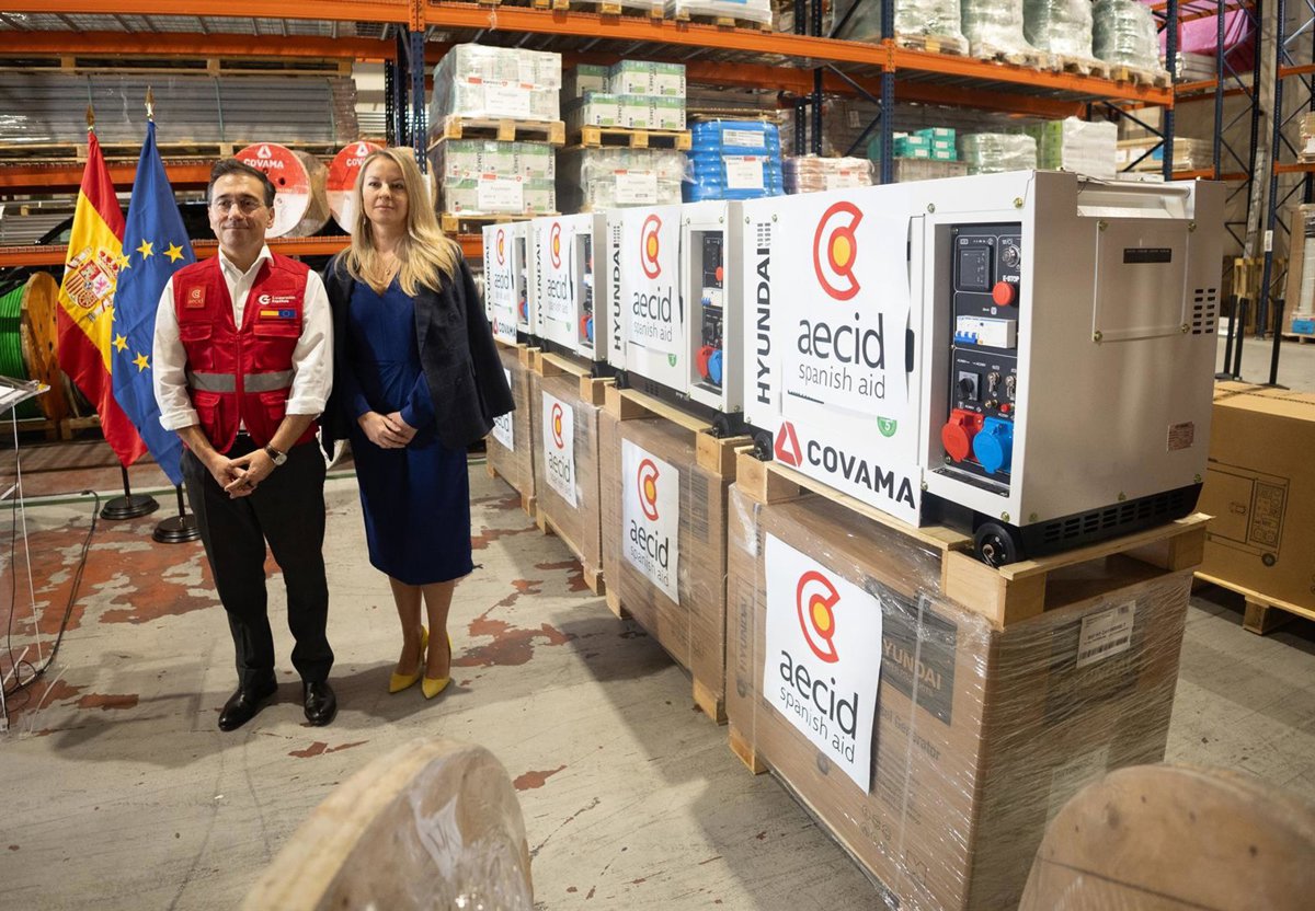 El ministro de Asuntos Exteriores, Unión Europea y Cooperación, José Manuel Albares, ha hecho entrega a la embajadora de Ucrania en Madrid, Yuliia Sokolovska, de los 70 generadores que la Agencia Española de Cooperación Internacional para el Desarrollo (AECID) va a hacer llegar a este país de cara al invierno.