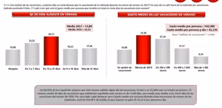Asimismo, el número medio de días de vacaciones que tendrán los españoles este verano muy similar a los 14,11 días del 2016. Un 17,02 por ciento de afortunados tendrá más de 21 días descanso; mientras que un 22,23 por ciento sólo disfrutará de entre 1 y 7 días.