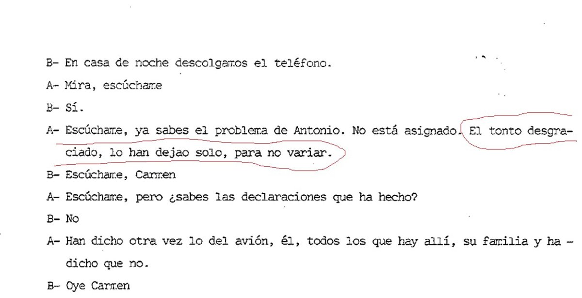 Así consta en decenas de conversaciones intervenidas por la Guardia Civil a la mujer del golpista el 23-F y algunos días posteriores, que han sido desclasificadas 45 años después por el Ejecutivo, en las que Díez Pereira lamenta insistentemente que su marido ha sido "engañado".