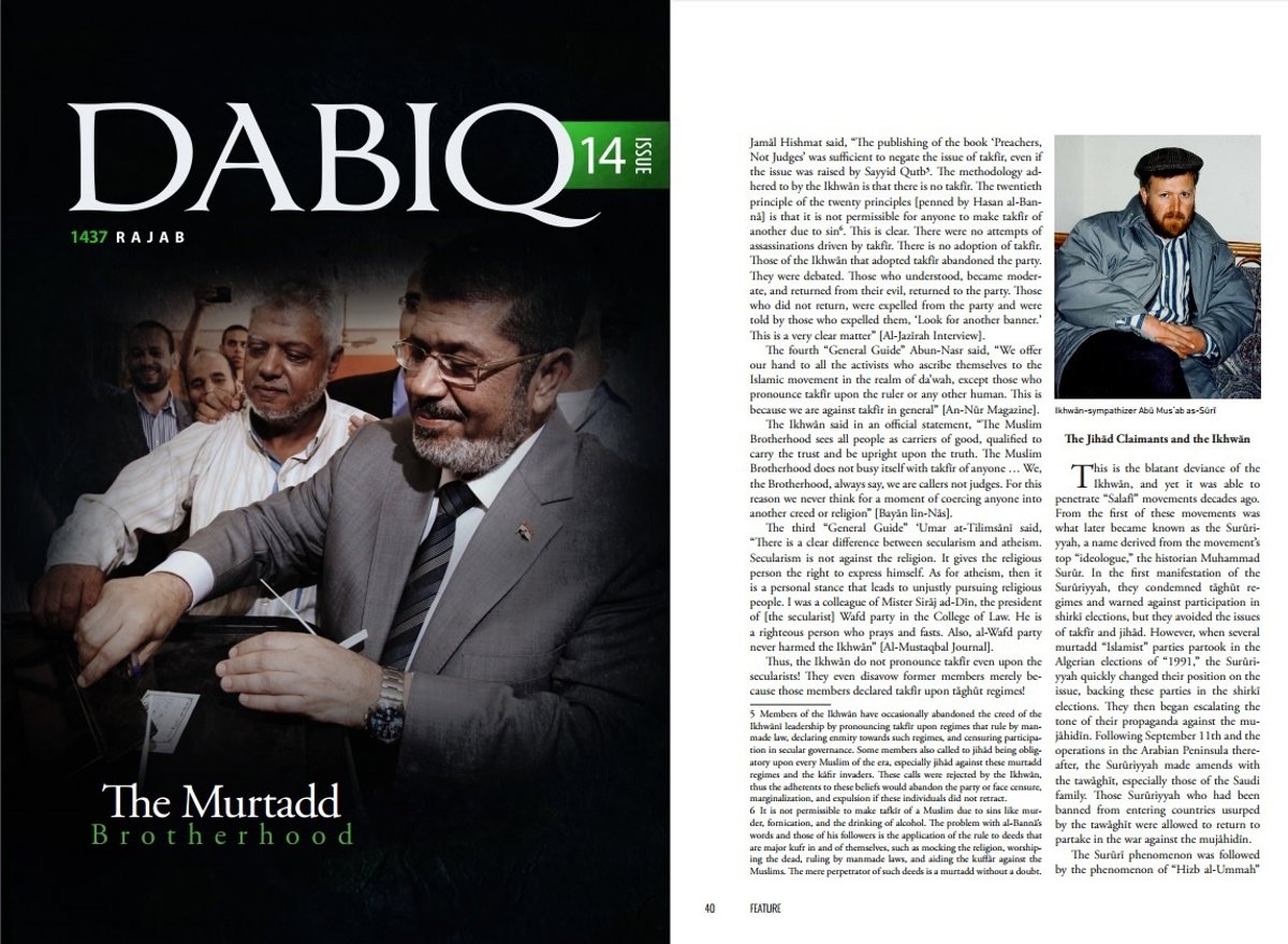 "Considera (Setmarian) que los Hermanos Musulmanes son los recuperadores de la yihad, como si ignorase el hecho de que gastaron todos sus esfuerzos para servir a la democracia!", denuncia el Estado Islámico, que dedica la portada a Mohamed Mursi con el siguiente titular: 'The Murtadd Brotherhood' (La hermandad apóstata).