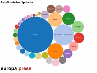 Tras estas dos ramas, destacan los estudios en Historia, Ciencias Políticas, Sociología, Medicina, Filología y Filosofía. Puedes pasar el ratón sobre el gráfico para comprobar los estudios de los diputados.