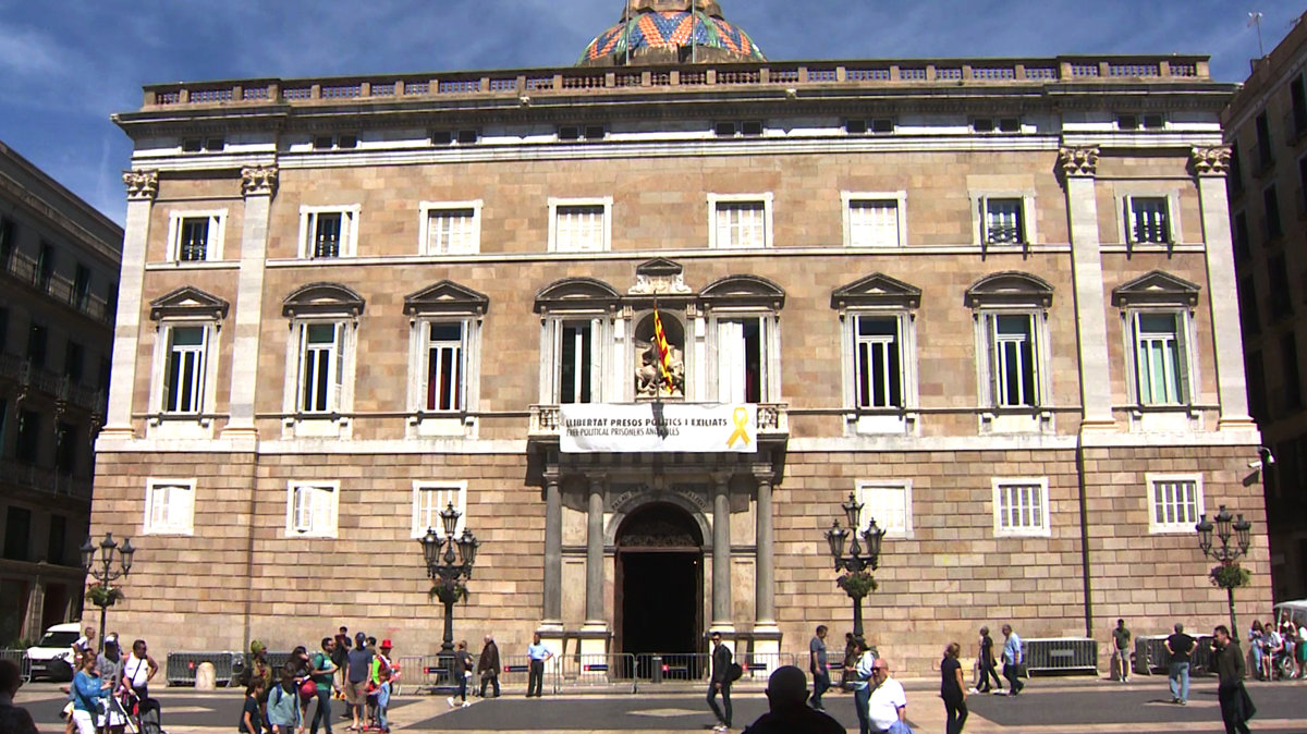 El palacio de la Generalitat vuelve a colgar una pancarta en la que se lee 'Llibertat presos polítics i exciliats', 'Free political prisoners and exiles', junto con un lazo amarillo, un día después de las elecciones autonómicas, municipales y europeas - Europa Press TV