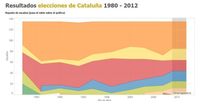 El gráfico incluido en esta noticia recoge la evolución del voto y del reparto de escaños en Cataluña desde las primeras elecciones autonómicas de la democracia celebradas en 1980.