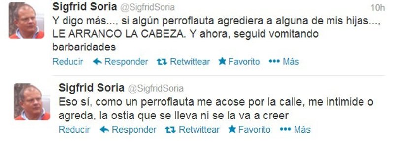 Durante la madrugada del jueves, Sigfrid Soria intercambió varios mensajes con otros internautas sobre los escraches que se están produciendo contra algunos miembros del PP, y llegó a decir que seguirá proclamando y ejerciendo, llegado el caso, su derecho de legítima defensa contra cualquier "perroflauta" que le agreda. "Sin duda alguna", apostilló.