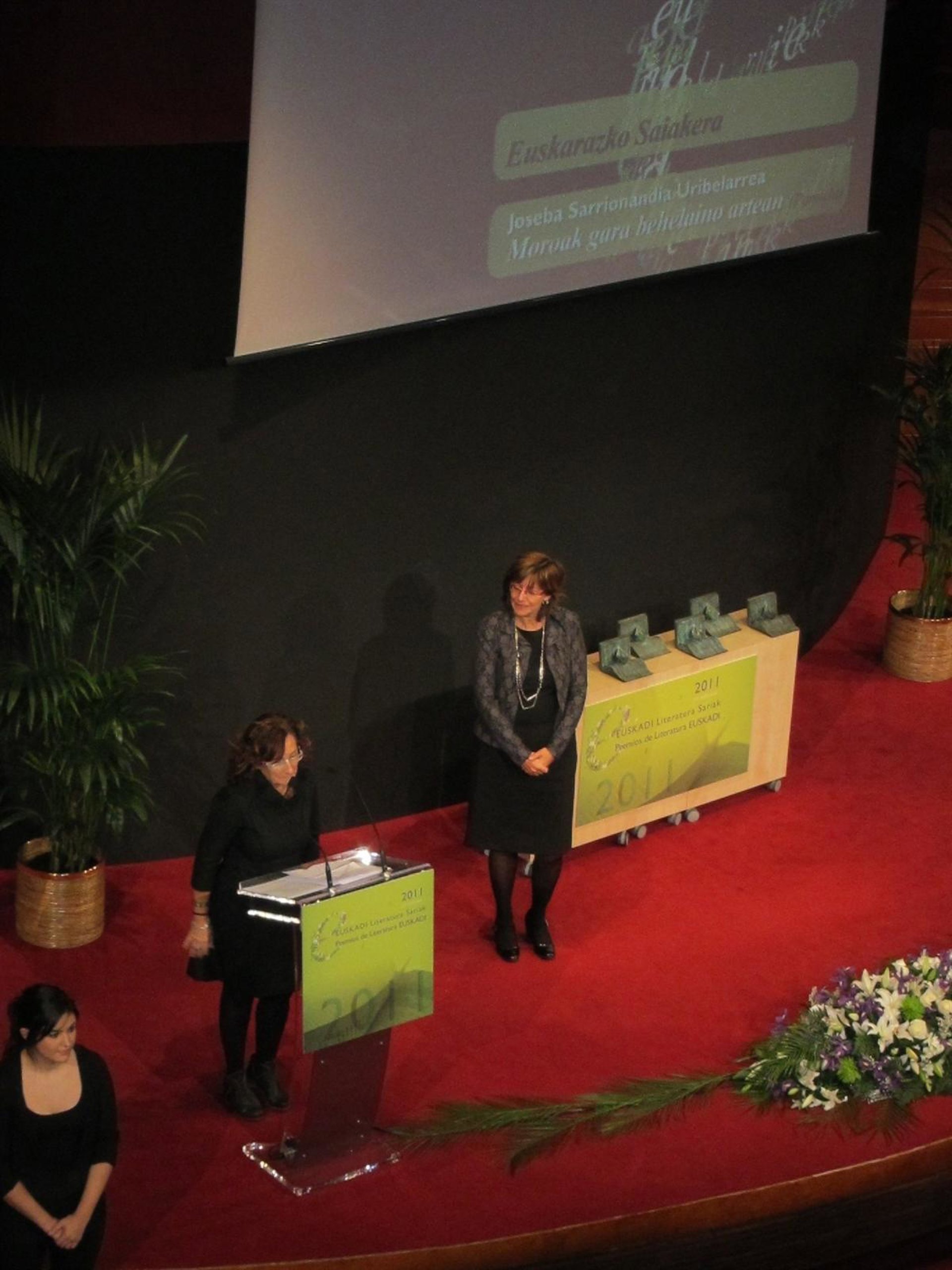 María Jesús Sarrionaindia ha recogido este jueves, en nombre de su hermano, el Premio Euskadi de Literatura 2011 en la modalidad de ensayo en euskera. La ceremonia de entrega de estos galardones, celebrada en Vitoria, ha estado presidida por la consejera vasca de Cultura, Blanca Urgell. Además de Sarrionaindia, los premiados en el resto de modalidades de los galardones son Ur Apalategi, Jon Bilbao, Miren Agur Meabe, Karlos Zabala, Iban Barrenetxea e Iñaki Uriarte.