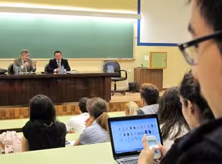 Enrique Barón ha participado en una conferencia en el Aula Magna Karl Marx de la Facultad de Ciencias Económicas, dentro de las acciones del Aula Europea de Primavera, una actividad puesta en marcha por la Cátedra Jean Monnet 'ad Personam' de economía europea. En su charla, ante un aula magna prácticamente llena, el político socialista ha abordado los aspectos políticos y sociales de la crisis económica y financiera de la Unión Europea como una de las primeras aportaciones a un curso de especialización en la UE en el que participan figuras del proceso de construcción de la Unión.