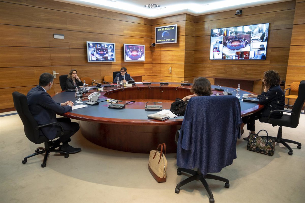 El presidente del Gobierno, Pedro Sánchez (1i), la vicepresidenta primera, Carmen Calvo (2d), el ministro de Sanidad, Salvador Illa (3d), la ministra de Transición Ecológica, Teresa Ribera (2i) y la ministra de Hacienda Maria Jesús Montero - Moncloa