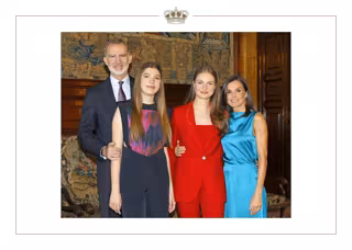 En cuanto a la foto elegida para la felicitación, se trata de una imagen inédita de los Reyes Felipe VI y Letizia junto a la Princesa Leonor y la Infanta Sofía en el interior del Palacio Real después de presidir el Relevo Solemne de la Guardia Real con el que se iniciaron el 19 de junio las actividades para conmemorar el décimo aniversario de la llegada al trono del monarca.